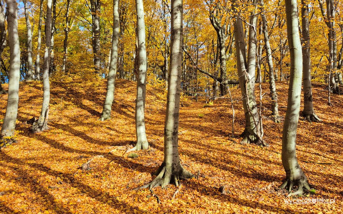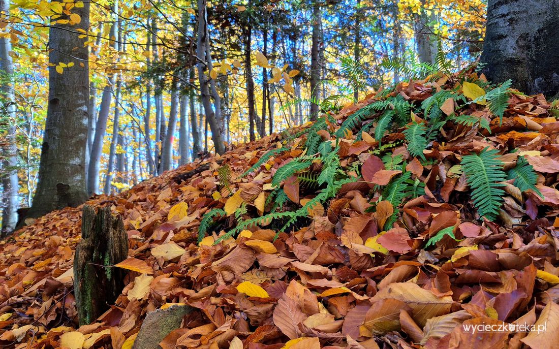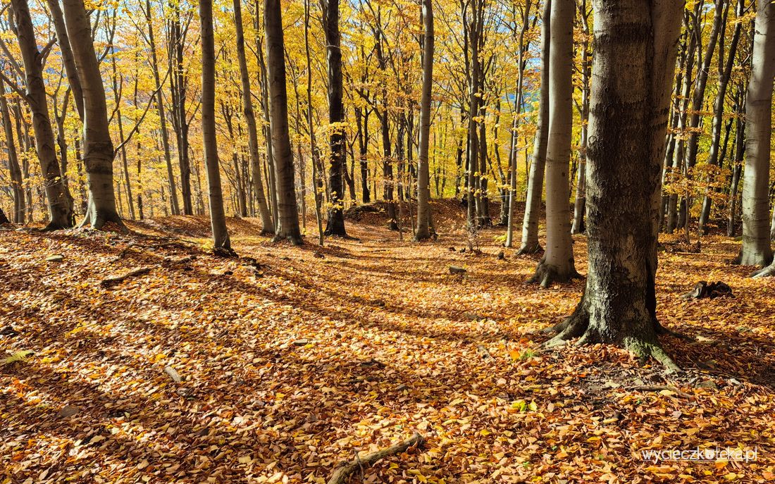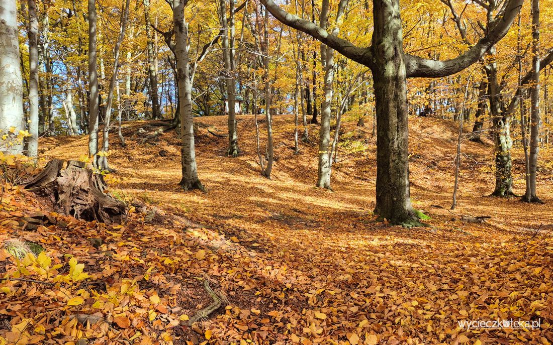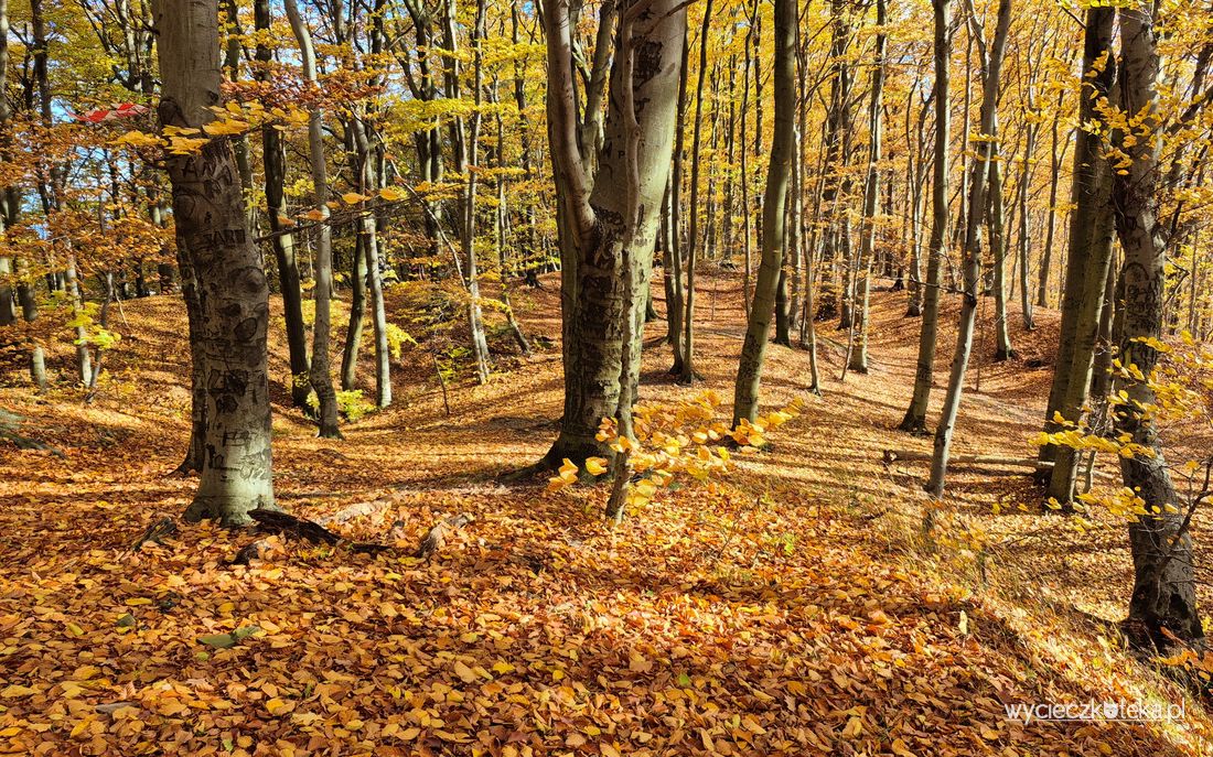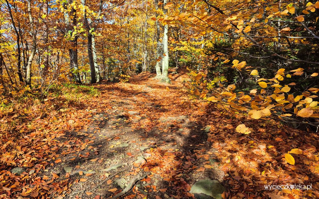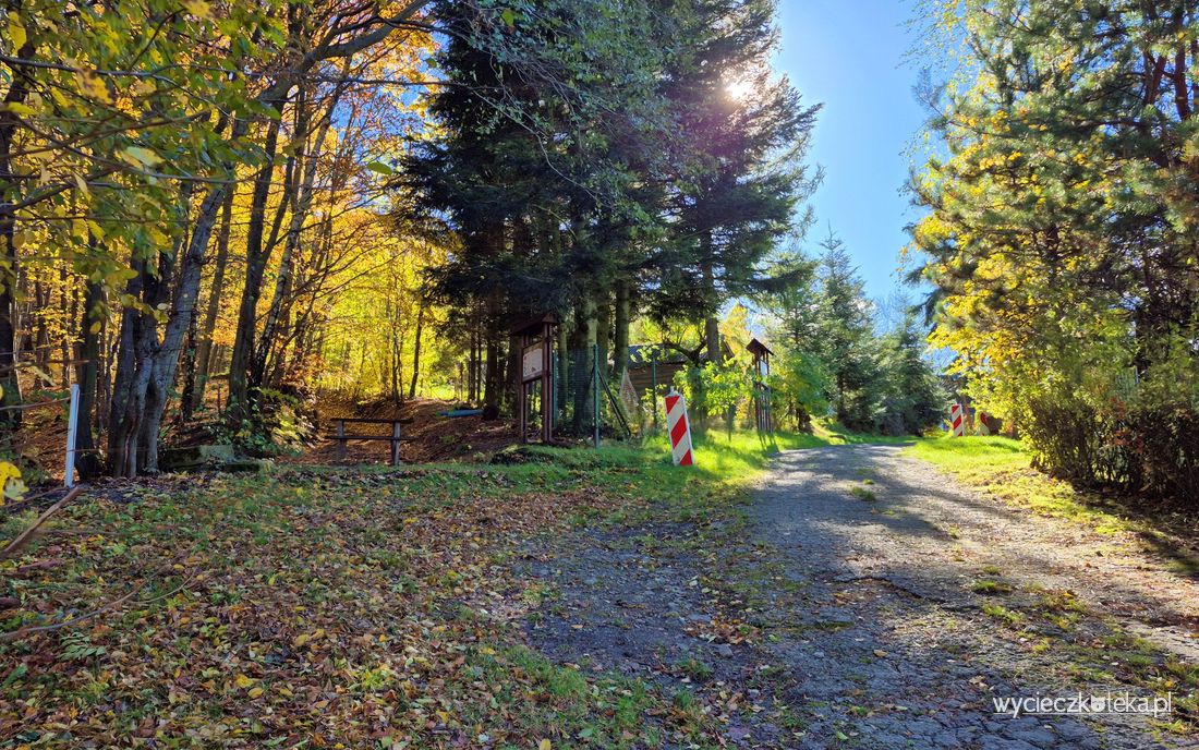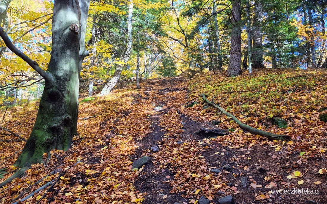 Z powrotem w dół do rozwidlenia dróg, zaraz za załamaniem zakrętu (3) szlak wchodzi w las i zaczyna ostro piąć się w górę, poprowadzony jest starą leśną drogą, która miejscami głęboko wcięła się już w stok. Oznaczenia szlaku pod koniec października 2025 zostały świeżo odmalowane, więc łatwo odnaleźć się tutaj w terenie. Według mapy do przełęczy między Grodziskiem a Borkiem pozostało Ci ok. 20 minut, w mojej ocenie czas ten jest mocno zawyżony, bo ja z parkingu na Borek weszłam w 25 minut.