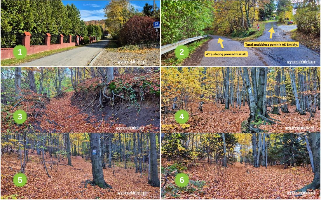 Start na zachodnich stokach Cietnia, gdzie jest zbudowany parking na kilka samochodów, przebiega przy nim szlak niebieski. Wpierw droga prowadzi asfaltem pod górę wzdłuż zabudowań. Po około 5 minutach marszu droga się rozwidla (2), na wprost jest niewielki zakręt – to kierunek dalszej wędrówki, warto jednak pójść w prawo pod górę, w tym miejscu ustawiony jest pomnik upamiętniający oddział partyzancki AK „Śmiały” obwodu „Murawa” pod dowództwem Władysława Fajkowskiego, który bazował w zabudowaniach Andrzeja Dudzika i Władysława Morajki w Poznachowicach Górnych (49.821323, 20.142036). Po lewej od pomnika w las wchodzi stara droga, wygląda obecnie bardziej jak ścieżka, można nią podążyć do góry bez szlaku, wyżej łączy się ze znakowaną trasą – jak wygląda to podejście możesz obejrzeć powyżej przy opisie wejścia na Borek w Beskidzie Wyspowym.