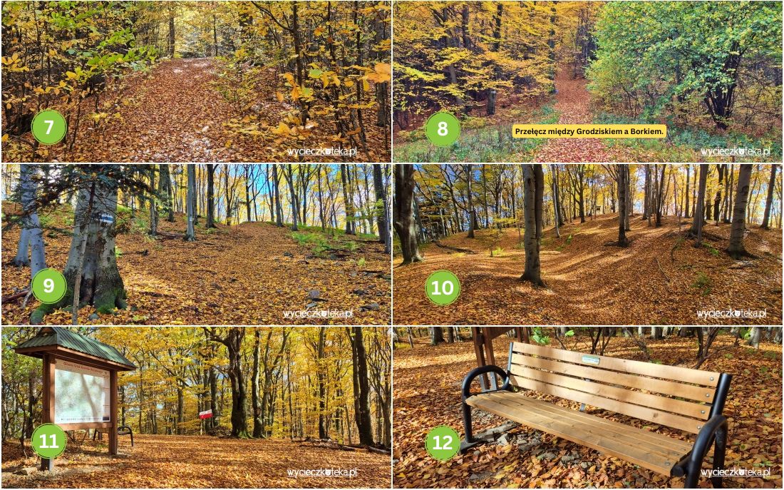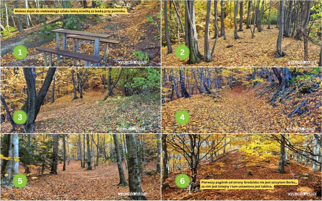 Po wejściu na przełęcz między Grodziskiem a Borkiem (8) polecam podejść na Borek, o tym kilka słów wyżej, a z Borka z powrotem na przełęcz i niebieskim szlakiem w górę wprost na Grodzisko. Tutaj, stawiając kroki, trzeba bardzo uważać, szczególnie, gdy liście lub śnieg zakryją drogę, gdyż jest tu pełno ruchomych kamieni, bardzo łatwo o kontuzję. To ostatnie 10 minut marszu i pozostaje zwiedzanie dawnego grodu i powrót niebieskim szlakiem na parking. U mnie wycieczka na Borek i Grodzisko zamknęła się w ok. 1 h 10 min.