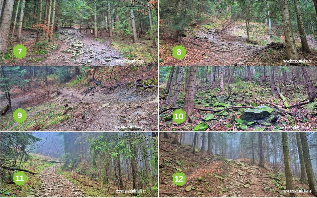 Po około 20 minutach szlak wprowadza w las i tutaj po chwili oczom ukazuje się pierwsze strome i śliskie podejście, na którym łańcuch ułatwiłby wspinaczkę, można tutaj wypluć płuca, jednak dalej ścieżka pozwala nieco odpocząć. Za nim po lewej widać piękne głazowisko.