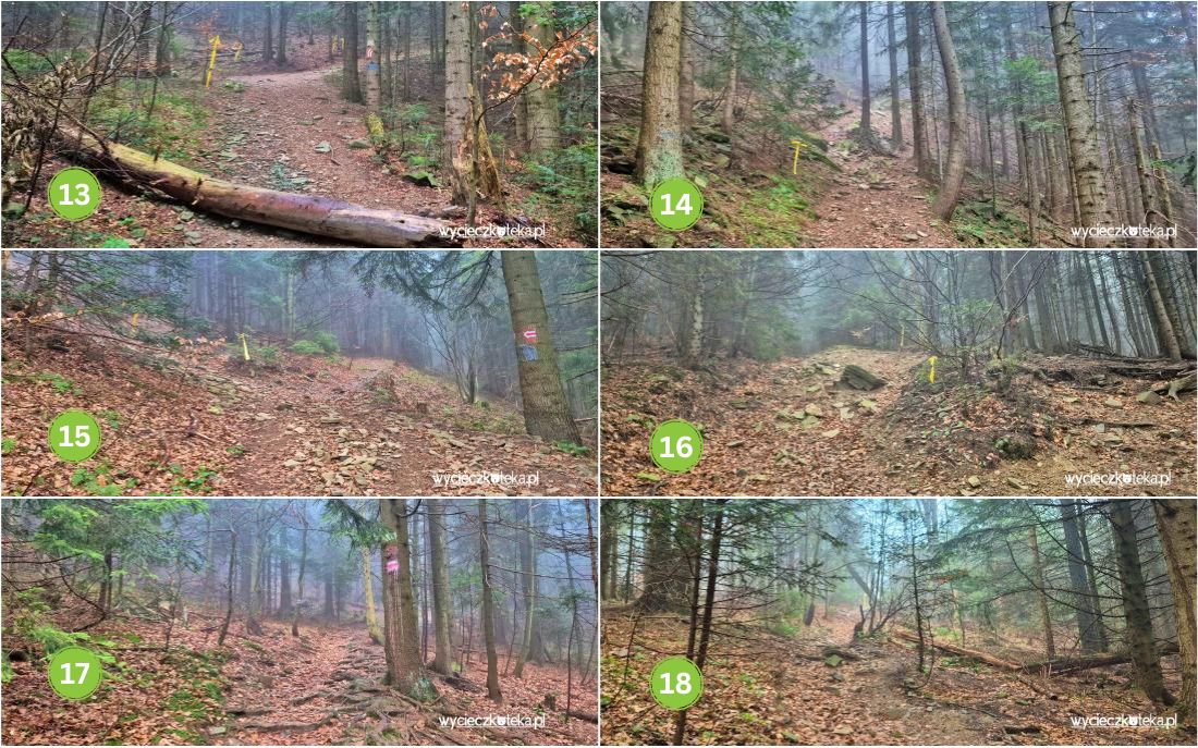 Następnie ścieżka zmienia się w szeroką drogę, kolejne ostre podejście pojawia się po 40 minutach, a 5 minut później, po tym jak szlak ostro skręca w lewo, jest jeszcze jedna stromizna i można wreszcie odetchnąć. Kolejne około 5 minut marszu pod górę to lekkie podejście, po czym szlak czerwony na Luboń Wielki z Glisnego krzyżuje się ze szlakiem żółtym, tutaj w prawo. To ostatnia prosta, pozostało 5 minut do schroniska, do pokonania jest jedynie 8 metrów różnicy wysokości. Powrót tą samą trasą zajmuje około 1 godzinę, gdy jest mokro i szlak śliski, lecz przy szybkim zejściu można pokonać trasę w 40 minut.