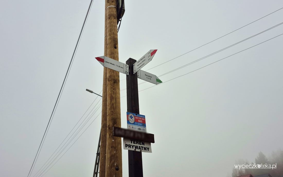 Po przejściu z parkingu przez drogę asfaltową szlak czerwony na Luboń Wielki przechodzi przy domach, po czym wprowadza na polną drogę, to najprzyjemniejszy fragment trasy, niemal po płaskim, lecz ciężko na nim wypatrzeć oznaczenia szlaku. Po prawej i lewej ręce roztaczają się ładne widoki, za plecami góruje Szczebel. Podaję czasy przy przejściu bardzo powolnym tempem w około 1 h 15 min, gdyż dokumentowałam trasę i po drodze robiłam striptiz, gdyż kolejne podejścia podgrzewały atmosferę w cebulowych warstwach odzieży, jednak bez zbędnych postojów dojdziesz na szczyt w godzinkę.