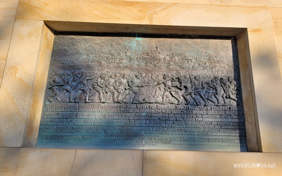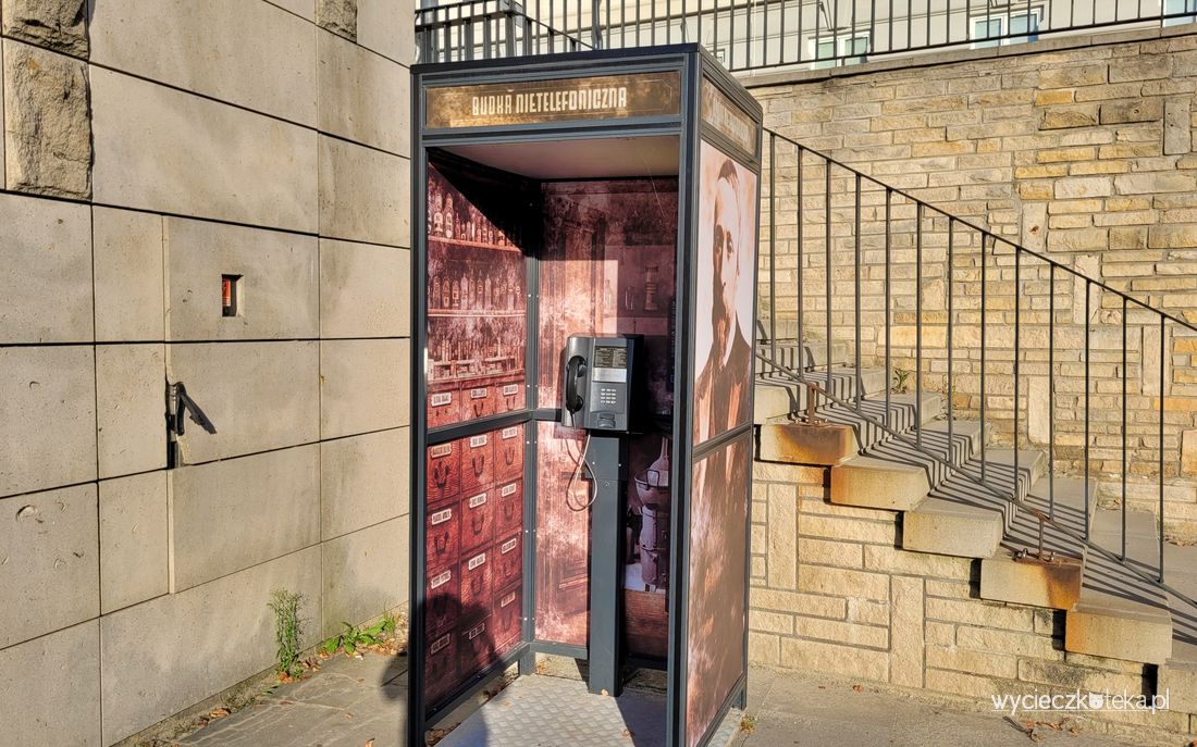 Spod ratusza zeszłam schodami na płytę rynku i Tobie też to polecam, jest tutaj ciekawa atrakcja turystyczno-historyczna. W rogu tuż przy ścianie oporowej ze schodami znajdziesz wejście do Pawilonu Historii Miasta Gorlice, a przy nim budkę nietelefoniczną. Ta niecodzienna atrakcja turystyczna wygląda jak klasyczna budka telefoniczna, taka, jaką pamiętam z dzieciństwa, lecz nie jest to budka telefoniczna, to budka nietelefoniczna, która pozwala za darmo połączyć się z historiami różnych miejsc w mieście. Wystarczy podnieść słuchawkę i wybrać numer spośród przycisków, podpowiedź, co można posłuchać, znajdziesz na liście powyżej nich. Jedynym mankamentem jest tutaj głośność, nagrania są bardzo ciche. W pobliżu na murze oporowym umieszczona jest tablica upamiętniająca bitwę pod Gorlicami.