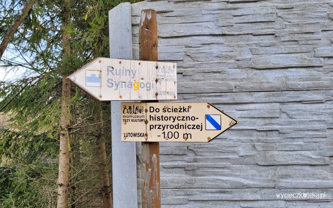 W Lutowiskach jest kilka ciekawych miejsc do obejrzenia, w zależności od tego ile masz czasu, możesz obejrzeć tylko punkty położone w bezpośrednim sąsiedztwie Wielkiej Pętli Bieszczadzkiej lub wybrać się na dalszą wędrówkę ścieżką historyczno-przyrodniczą Ekomuzeum „Trzy Kultury” w Lutowiskach. Pomysłodawcy proponują, aby rozpocząć zwiedzanie Lutowisk przy neogotyckim kościele, jest tutaj spory parking, na którym można pozostawić samochód (są tutaj tablice informacyjne o atrakcjach turystycznych w gminie). Ścieżka wokół Lutowisk ma 13 km i jeżeli poruszasz się autem, to ja polecę Ci wystartować w innym miejscu, przy cerkwisku i stąd później podjechać do miasta, aby obejrzeć mural w Lutowiskach, ruiny synagogi, neogotycki kościół, horoskop celtycki i owadzie śródmieście. Punktów na trasie jest sporo, mi udało się dotrzeć do kilku z nich, jeden z punktów trasy, Stanicę Kresową Chreptiów obejrzałam nim dojechałam do Lutowisk, wpis o niej znajdziesz tutaj: Stanica Kresowa Chreptiów w Lutowiskach – filmowa ciekawostka Bieszczad.