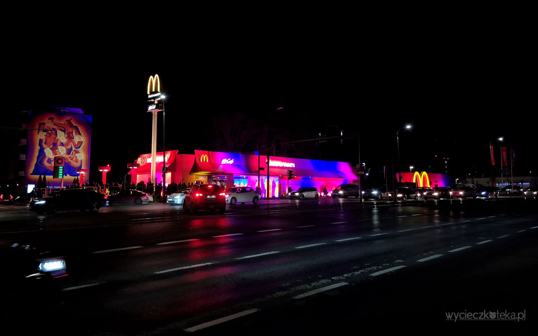 Wesoły, kolorowy McDonald’s w Poznaniu to element strategii marketingowej marki, prawdopodobnie po 19 listopada budynek powróci do szarej rzeczywistości, lecz od 13 listopada 2025 przyciąga tłumy i to nie tylko tych, którzy chcą spróbować tydzień wcześniej niż inni legendarnej kanapki Drwala, lecz także takich turystów jak ja. Ta sieciówka stała się nieodłącznym elementem popkultury, a barwny budynek mocno wybija się na tle smutnej jesiennej szarugi, przypominając nieco ogród świateł. Wieczorem jest tutaj gwarno, tętni życie, co obrazują ekrany termowizyjne na elewacji, pokazują wnętrze lokalu, w którym przebywają ludzie.