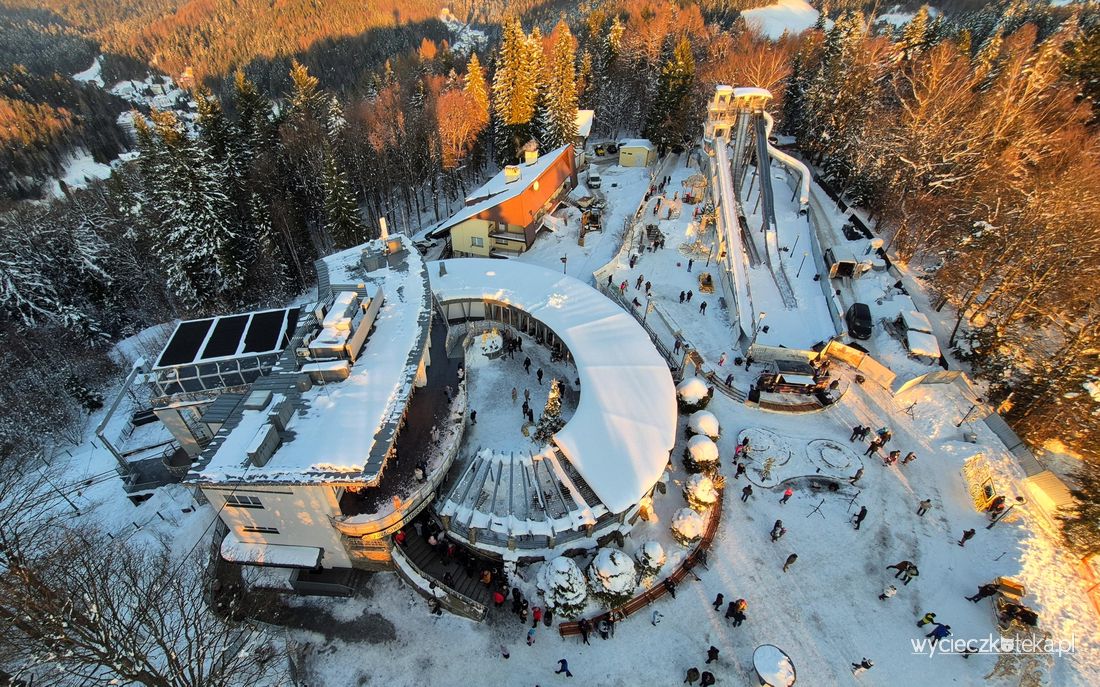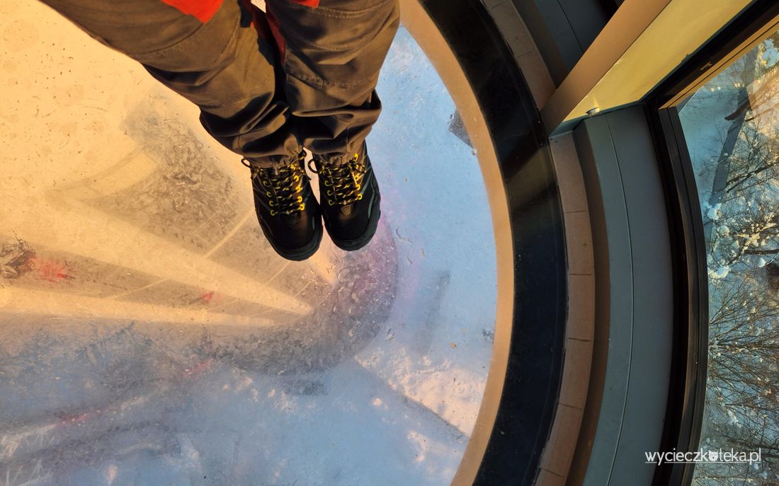 Dodatkową atrakcją jest wykusz z przeszkloną podłogą, znajduje się on w zamkniętej części tarasu widokowego. Ten specyficzny sky walk pozwala powalczyć ze swoimi lękami, spojrzeć kilkadziesiąt metrów w dół. Podobne atrakcje są dostępne na PKL Solina i Sky Walk Serce Poronina, lecz tam są one pod gołym niebem. Po szklanym tarasie przejdziesz się także na Leśnym Molo w Starym Sączu. Wszystkie te trzy miejsca również polecam, ich opisy znajdziesz u mnie na blogu.