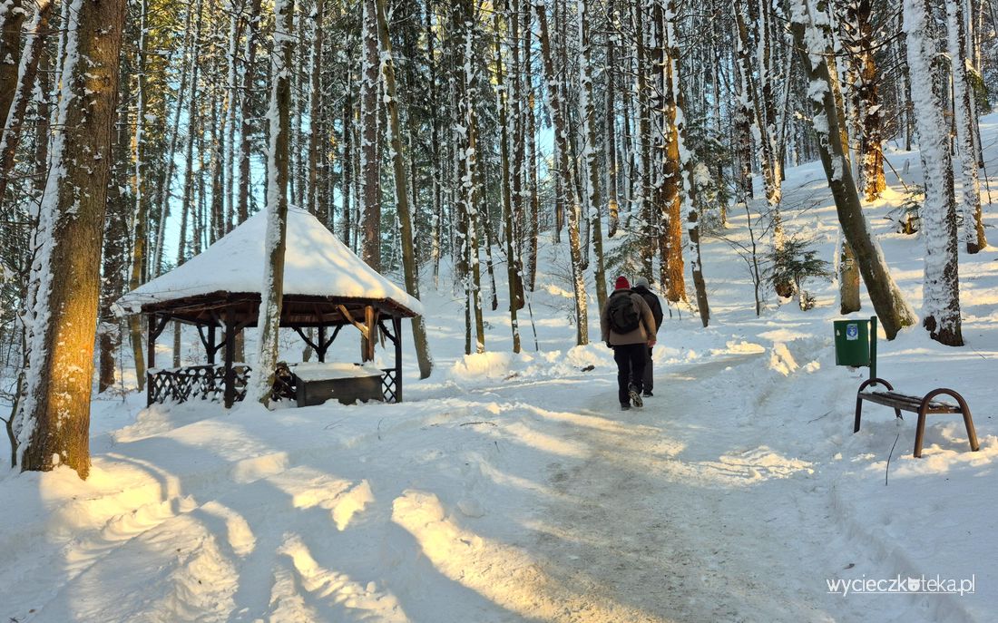 Szlak żółty na Górę Parkową z Krynicy-Zdroju wije się zakosami, prowadzi szerszymi drogami i wąskimi ścieżkami, które w słoneczny zimowy dzień wyglądają wyjątkowo uroczo. Trasa nie jest zbyt wymagająca, lecz trzeba nastawić się, że jednak czuć, że chodzi się po górach.